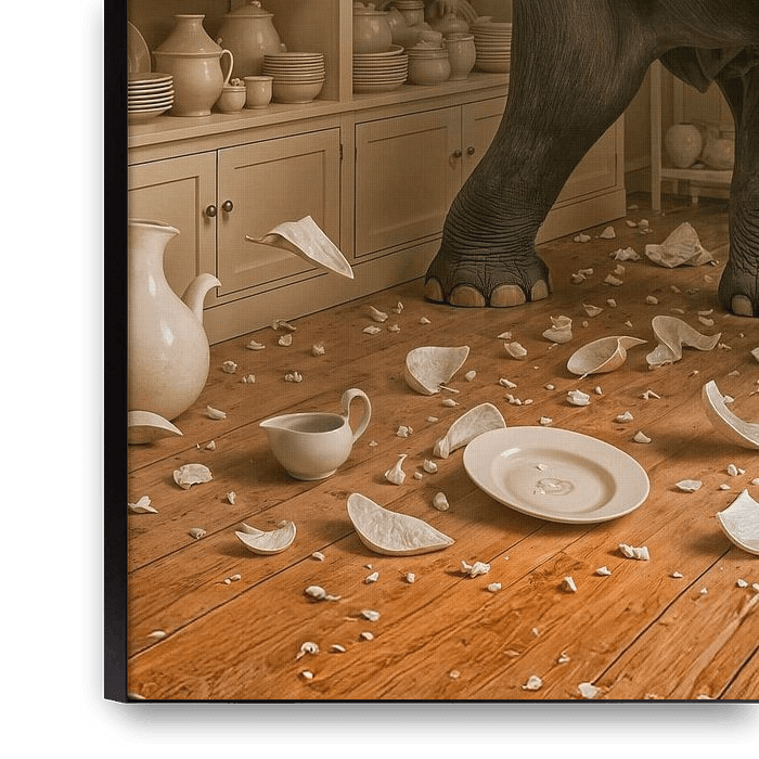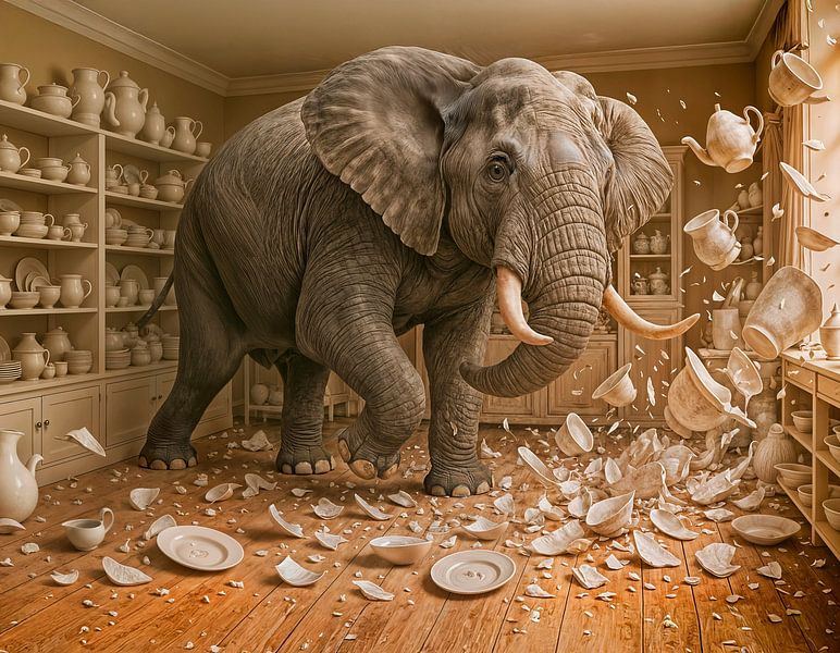 Ein fotorealistischer Elefant stürmt durch ein Geschäft für feines Porzellan, wirft Regale um und zerschlägt edles Geschirr. Eine anschauliche und humorvolle Interpretation des Sprichworts „ein Elefant im Porzellanladen“ – nur noch viel größer.
