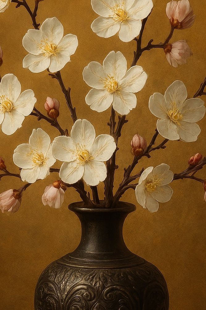 Ein atemberaubendes Blumenarrangement mit zarten Blüten in einer handbemalten Vase, perfekt eingefangen in einer warmen, stimmungsvollen Umgebung.