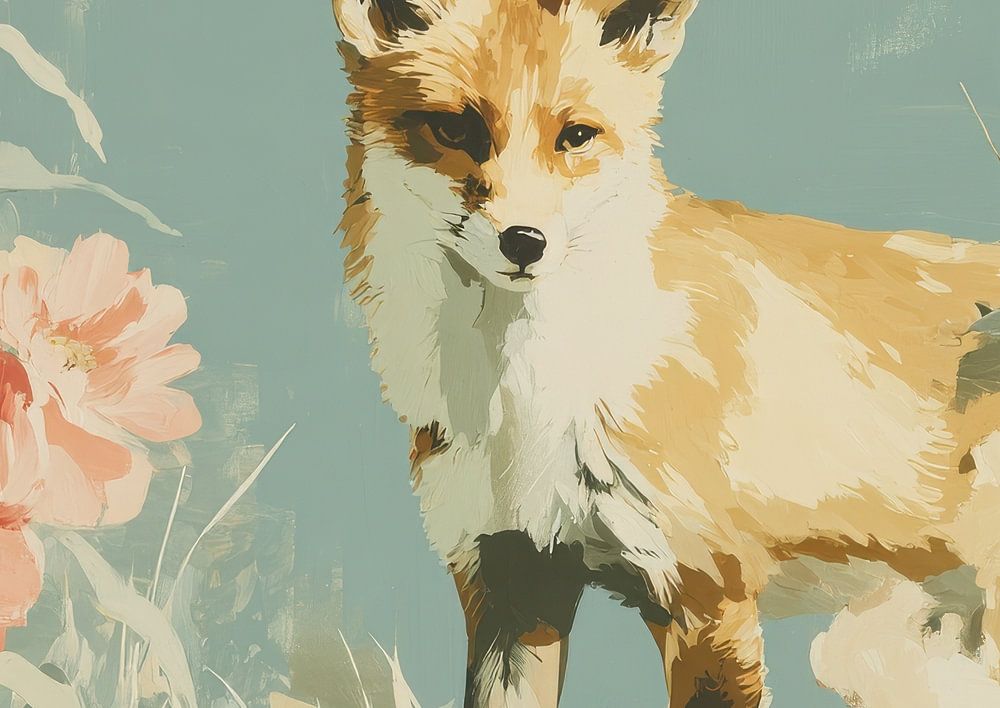 Ein eleganter Fuchs steht inmitten blühender Blumen, dargestellt in einer Vintage-inspirierten Illustration. Sanfte Pastellfarben und weiche Pinselstriche verleihen dem Motiv eine zarte, traumhafte Stimmung. Die harmonische Komposition aus floralen Formen und dem anmutigen Tier erzeugt eine ruhige, poetische Atmosphäre. Das Kunstwerk verbindet klassische Ästhetik mit moderner Leichtigkeit und fängt die Schönheit der Natur auf stilvolle Weise ein – ein zeitloses Motiv voller Charme und Eleganz.
