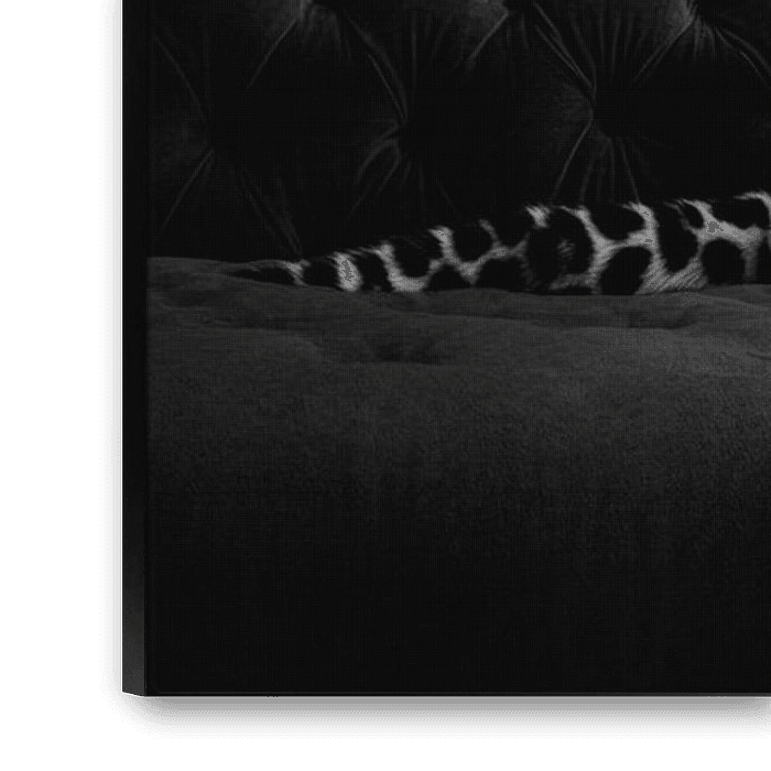 Ein majestätischer Leopard, sanft und gelassen, thront auf einer eleganten Couch und strahlt eine faszinierende Ruhe aus. Die monochrome Farbgebung hebt sein beeindruckendes Muster hervor und verleiht dem Raum eine edle Note. Ideal für das Wohnzimmer, bringt dieses Kunstwerk sowohl wildes Flair als auch stilvolle Eleganz in jeden Raum.
