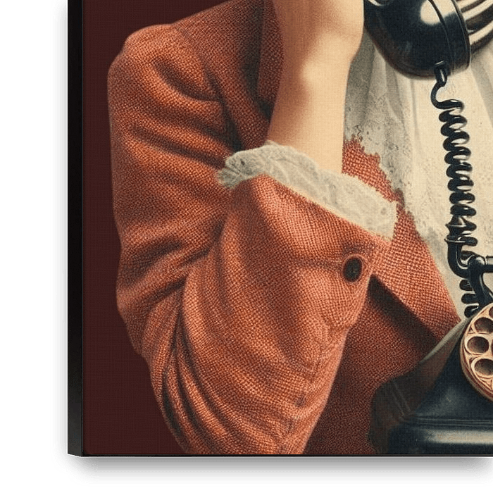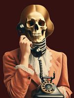 Ein stilvolles Skelett in eleganter Kleidung hält ein Vintage-Telefon in der Hand und verbindet dabei schwarzen Humor mit Eleganz. Die gedämpften Farbtöne und das detailreiche Design schaffen eine raffinierte und zugleich surreale Atmosphäre.