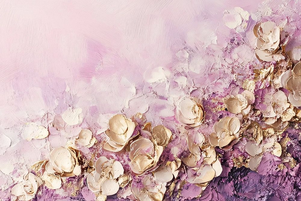 Dieses Kunstwerk ist ein elegantes und modernes Werk, das ein Gefühl von Ruhe und Raffinesse ausstrahlt. Die blühenden Blumen in sanften Rosa-, Lila- und Cremetönen werden durch dezente Goldakzente wunderschön akzentuiert. Die dynamische Textur verleiht dem Bild Tiefe und macht es zu einer perfekten Ergänzung für moderne Innenräume. Dieses Gemälde passt sowohl in ein Schlafzimmer als auch in einen Flur, wo es als Blickfang dienen und eine ruhige Atmosphäre schaffen kann. Der abstrakte Stil macht es vielseitig und passt zu verschiedenen Stilen, von minimalistisch bis eklektisch.