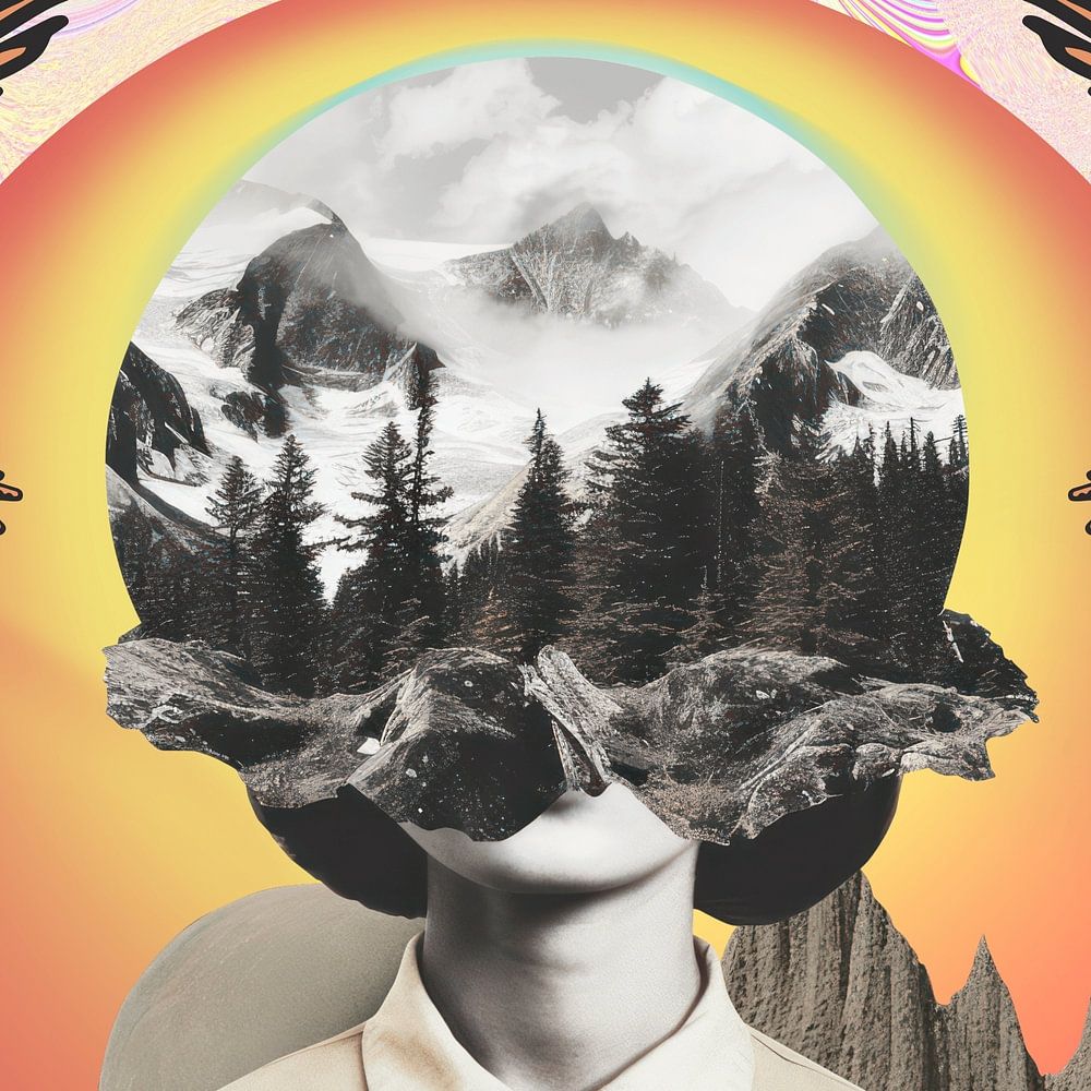 Ein psychedelisches und verträumtes Design, das ein Porträt mit einer Berglandschaft im Inneren des Kopfes zeigt. Die hellen und verspielten Elemente suggerieren eine außerweltliche Erfahrung.