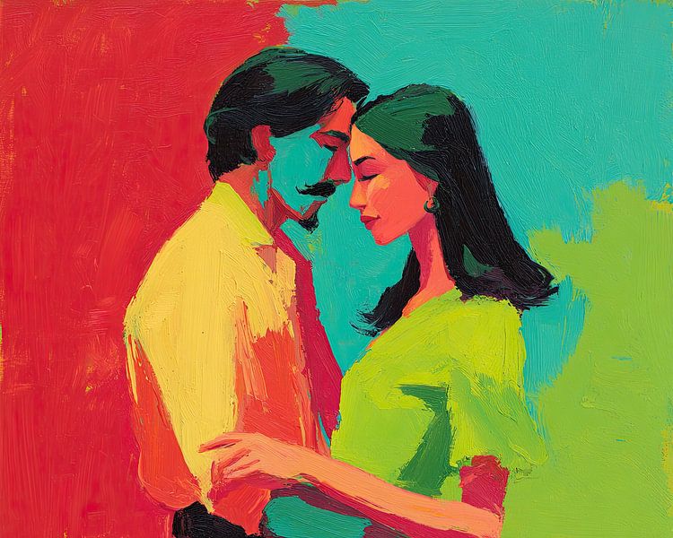 Electric Embrace - Ein Gemälde von einer Frau und einem Mann, das einen intimen Moment festhält, mit einer Frau in grüner Bluse und einem Mann mit Schnurrbart, umgeben von leuchtenden Farben wie Rot und Türkis, die ein Gefühl von Energie und Leidenschaft vermitteln.