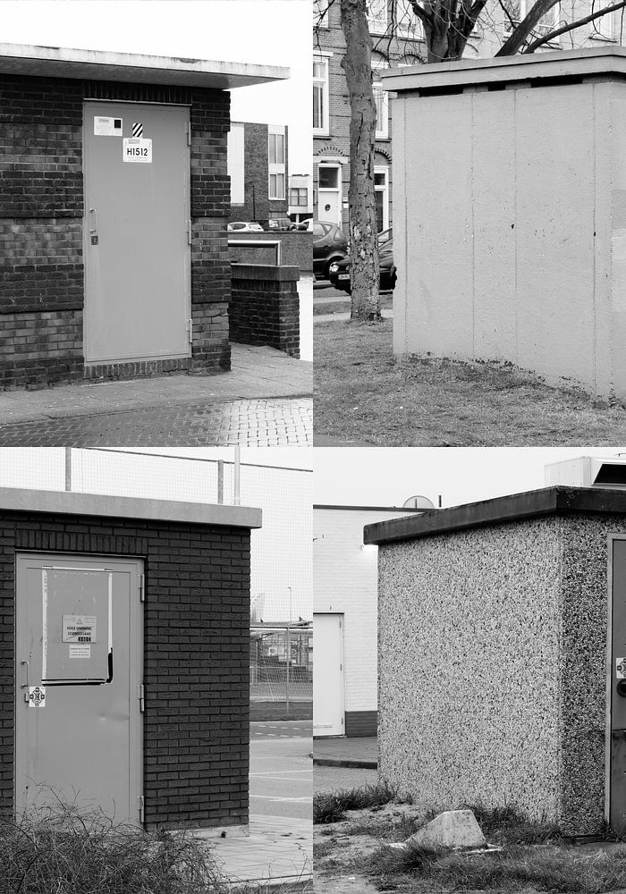 Die Abbildung zeigt schwarz-weiß dargestellte Stromkästen in einer Reihe. Jeder Schuppen hat ein einfaches Design, ein flaches oder leicht geneigtes Dach und eine Metallverkleidung, die Anzeichen von Verwitterung aufweist, was ihnen ein leicht abgenutztes Aussehen verleiht. Die Schuppen ähneln einander, wodurch ein Gefühl von Ordnung und Wiederholung entsteht.