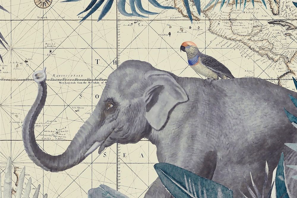 Elefant mit Vogel und tropischen Pflanzen über alten Vintage-Karte in Pastellfarben