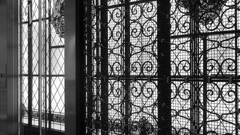 Lift in Vincci, Madrid. Klassieke stijl, metalen en gietijzeren smeedwerk. Mooi in zwart-wit.