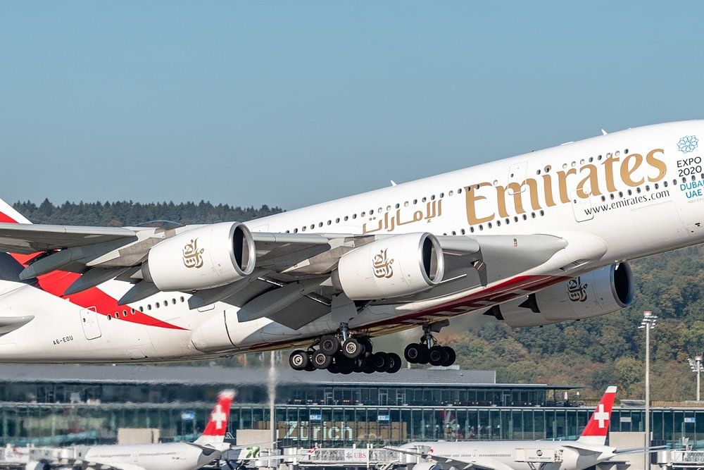 Ein Emirates Airbus A380 (A6-EOU) hebt an einem schönen sonnigen Herbsttag im Jahr 2018 vom Flughafen Zürich ab.