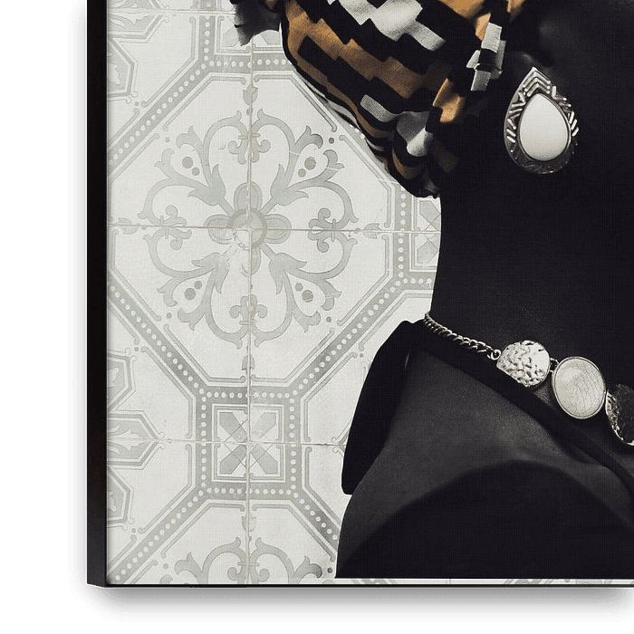 Die dunkle Haut des Modells bildet einen schönen Kontrast zu der gemütlich wirkenden Kachelwand im Hintergrund. Die Farben des Tuchs auf dem Kopf passen perfekt zu den Farben im Hintergrund.