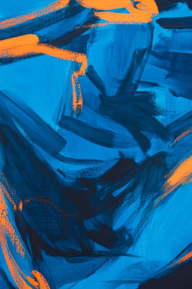 In einem faszinierenden Spiel aus kräftigem Blau und leuchtendem Orange entfaltet sich die Dynamik eines menschlichen Körpers. Die geschmeidigen Linien und kühnen Pinselstriche schaffen eine lebendige Präsenz, die sowohl Ruhe als auch Energie ausstrahlt. Die Kontraste betonen die Muskulatur und verleihen dem Werk eine anmutige, beinahe skulpturale Qualität.