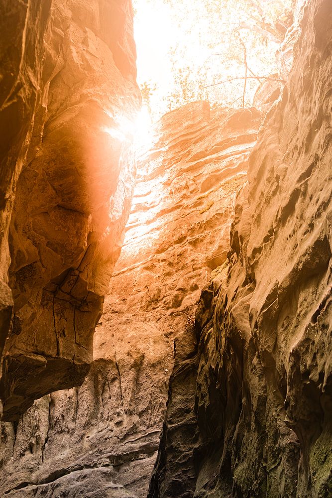 Im Grenzgebiet zwischen Deutschland und Luxemburg findet man wunderschöne Felsformationen aus Luxemburger Sandstein. Flüsse haben sich durch die oberen Schichten geschnitten und die Erosion hat dazu geführt, dass riesige Sandsteinbrocken abgebrochen sind und enge Schluchten und Klüfte bilden. Dieses Foto wurde in der Teufelsschlucht bei Irrel in Deutschland, im südwestlichen Teil der Eifel, aufgenommen. Es ist ein beliebtes Wandergebiet, in dem man als Fotograf und Künstler viele Stunden verbringen kann.