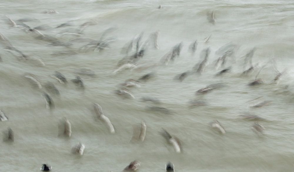 Dieses Bild wurde mit einer langen Verschlusszeit aufgenommen, um die Bewegung der Vögel auf den Wellen zu zeigen.
