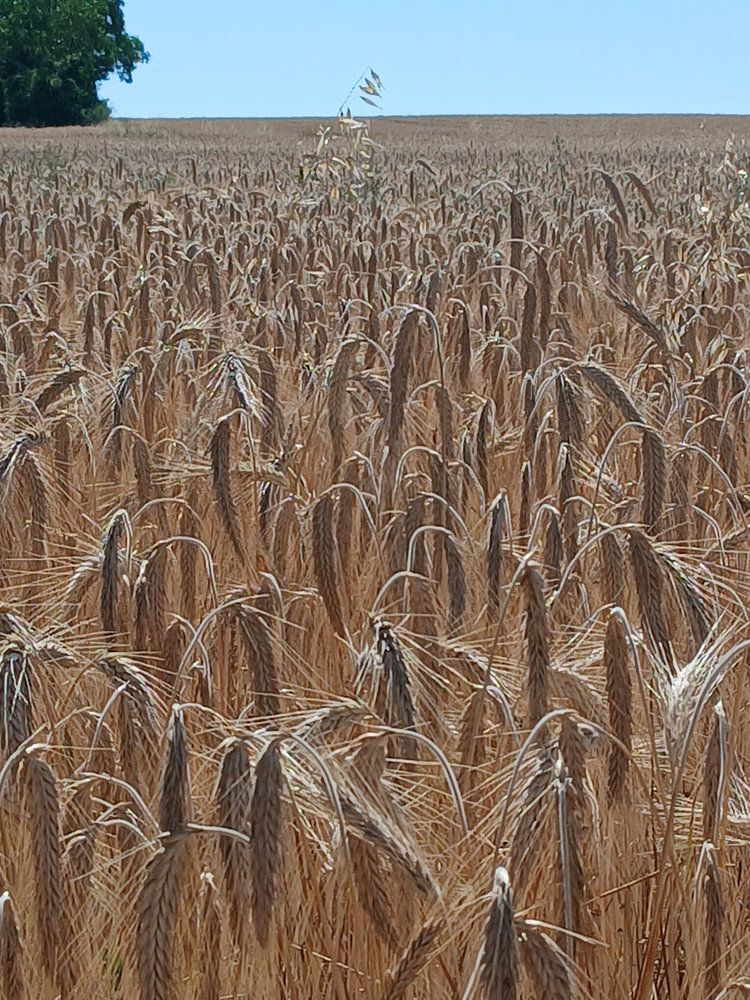 Blick auf ein Weizenfeld an einem sonnigen Tag in Frankreich. Ich habe kurz darüber nachgedacht, die Unebenheiten am Horizont mit einem Bildbearbeitungsprogramm zu beseitigen, aber da wir im Zeitalter der künstlichen Intelligenz bereits zu Tode mit Perfektion bombardiert werden, dachte ich, es wäre schöner, diese Unvollkommenheiten zu akzeptieren.