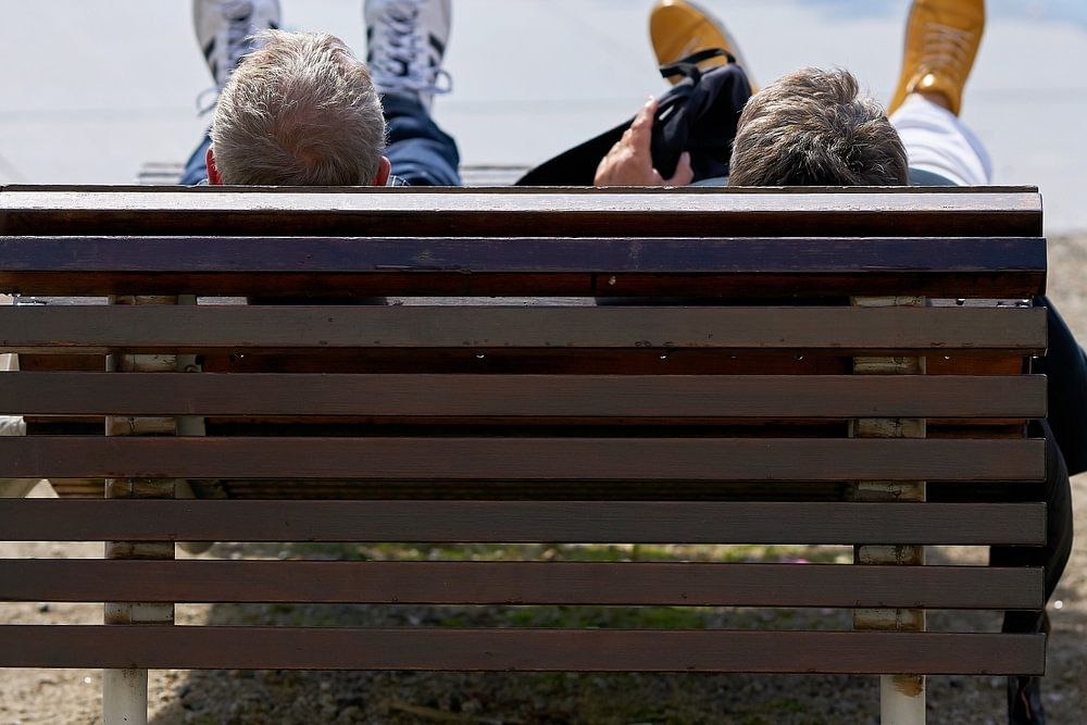 Ein Paar entspannt sich gemütlich in Ruhe liegend auf einer Bank in der Innenstadt von Swinemünde an der Ostsee in Polen und führt sorglos ein Gespräch