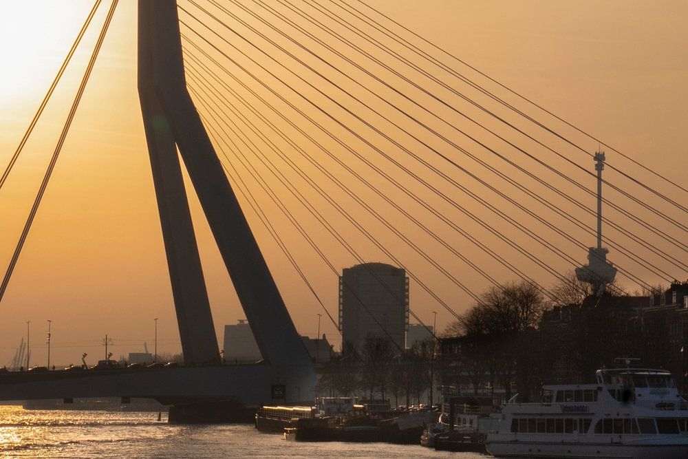 Ein goldenes Leuchten an der Erasmus-Brücke in Rotterdam. Das Foto wurde eine Stunde vor Sonnenuntergang im Februar 2019 aufgenommen.