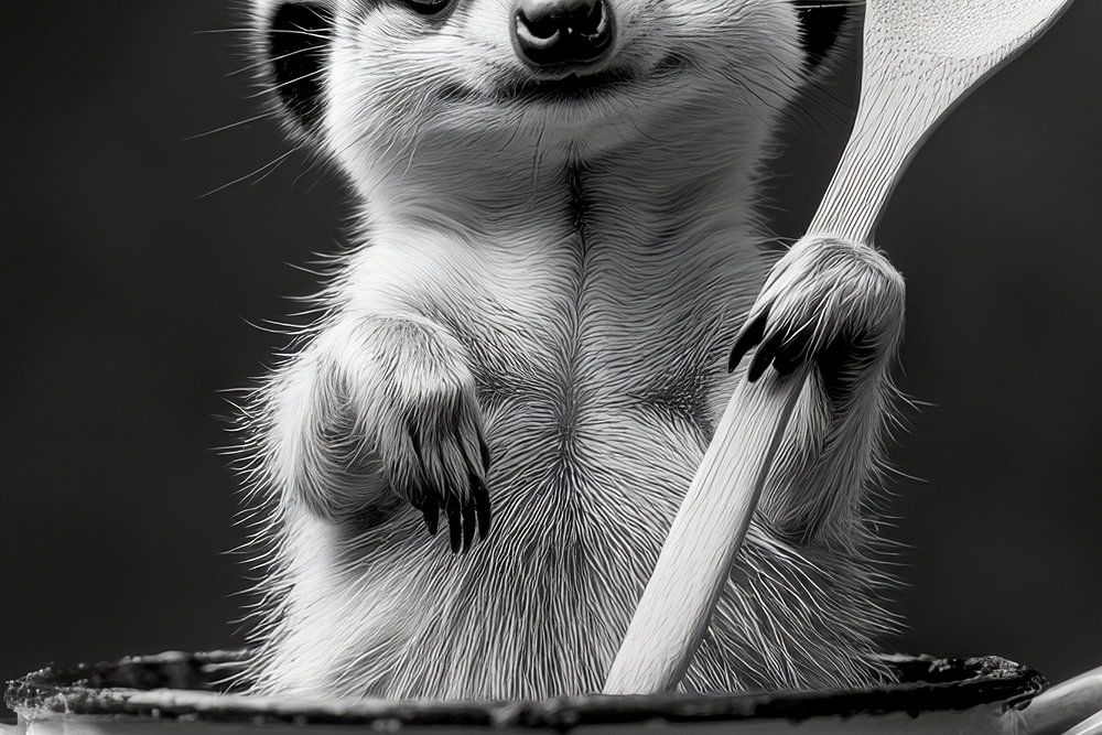 Ein vergnügliches Tierchen mit treuherzigem Blick erhebt sich aus einem Topf, ein Kochlöffel in seinen Händen. Die schwarz-weiße Szenerie verleiht dem Motiv eine charmante Nostalgie, die sowohl Freude als auch Humor ausstrahlt. Dieses lebhafte Kunstwerk eignet sich hervorragend für die Küche, um beim Kochen ein Lächeln hervorzubringen.