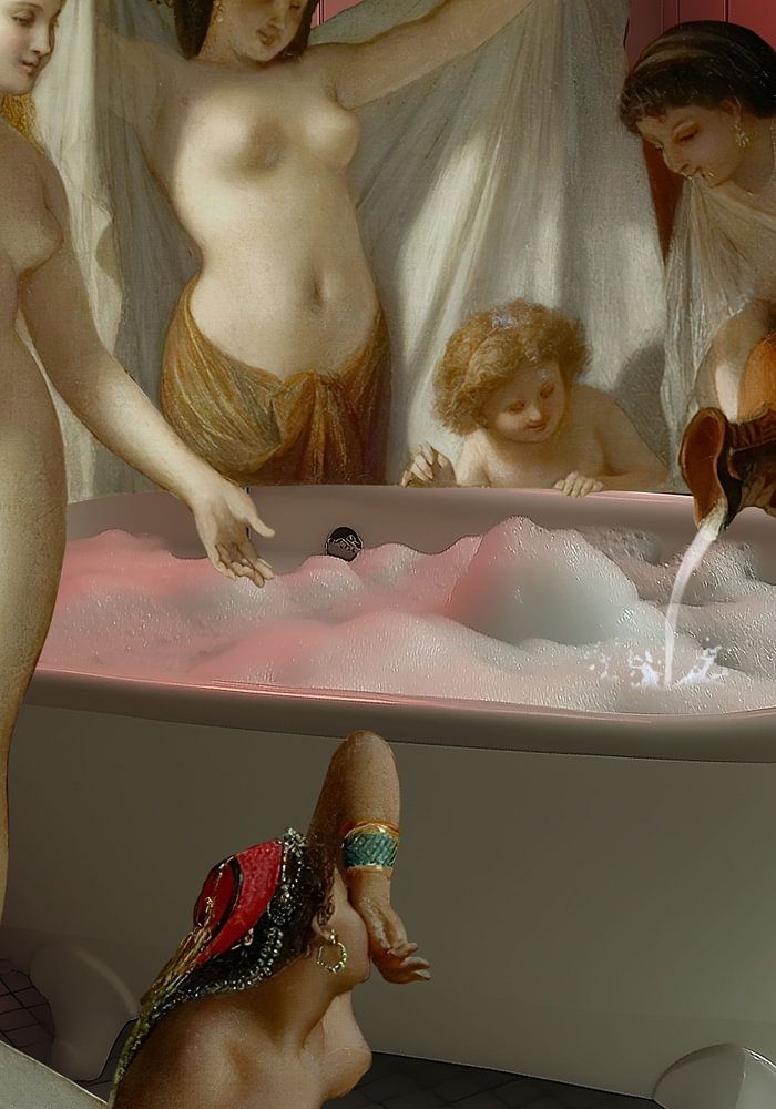 In dieser Collage sind schöne Nymphen aus neoklassischen Gemälden im schönsten Moment festgehalten: dem Beginn eines Bades. Die Szene strahlt Gelassenheit und Verjüngung aus, die sich in den Gesichtern der Nymphen widerspiegeln, die nicht nur in das Wasser einzutauchen scheinen, sondern auch in ein Ritual zur Erneuerung von Geist und Stimmung.