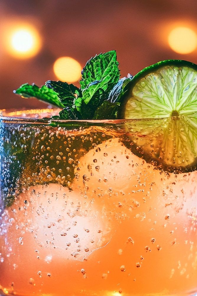 Erleben Sie einen erfrischenden Genussmoment mit diesem spritzigen Cocktail, der in einem eleganten Glas mit einem zarten Limettenrad und frischer Minze präsentiert wird. Die funkelnden Lichter im Hintergrund verleihen eine festliche Atmosphäre. Dieses Kunstwerk ist ideal für die Küche oder das Wohnzimmer, um Ihre Gäste sofort in Urlaubsstimmung zu versetzen.