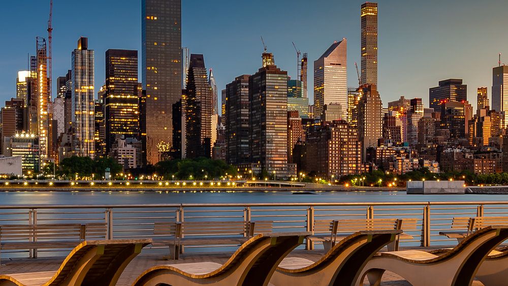 New York wacht früh morgens im Juni auf. Von Brooklyn aus können Sie das rasante Leben Manhattans in Ruhe von Ihrem bequemen Stuhl aus beobachten.