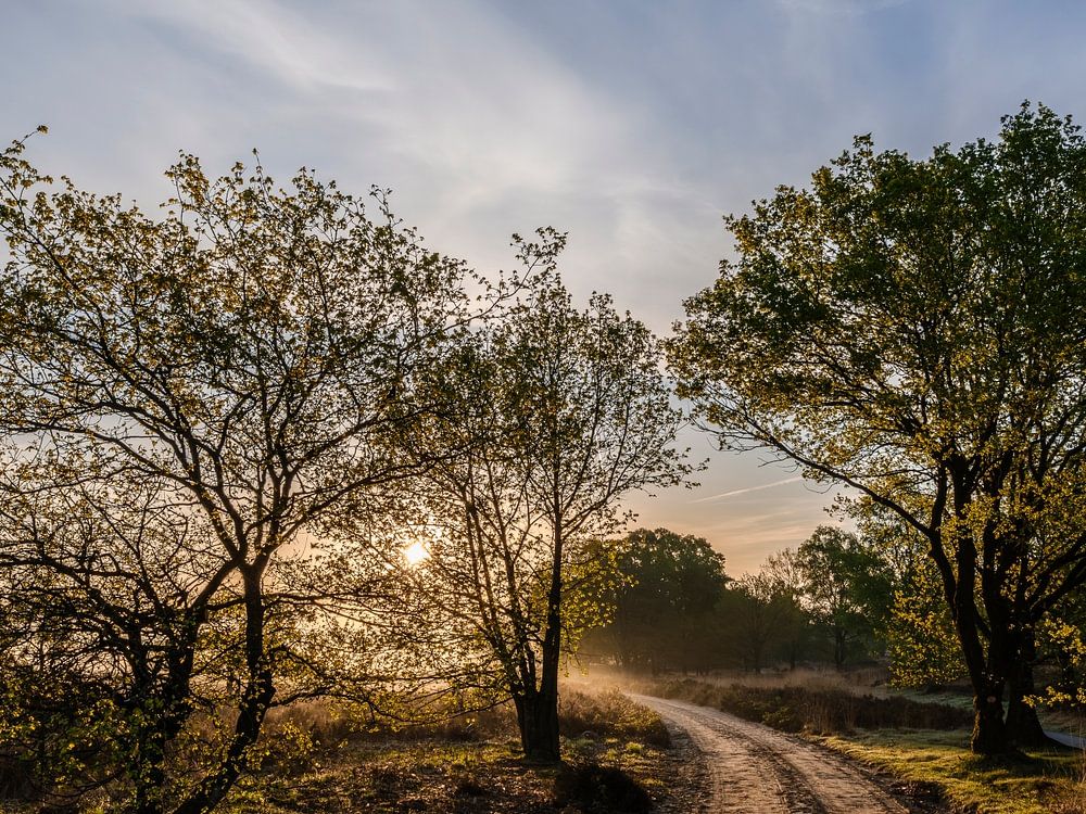 Ermelose Heidelandschaft am frühen Morgen. Mit einem schönen Sonnenaufgang und noch ein wenig Bodennebel.