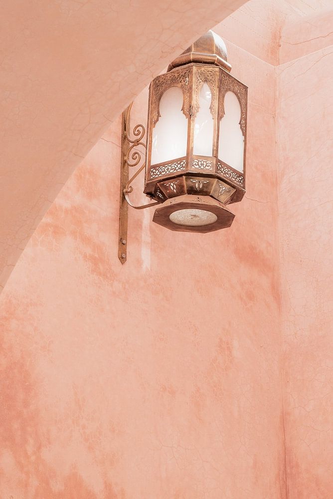 Eine rosafarbene Wand mit einer verschnörkelten Laterne aus der sofort erkennbaren und magischen Straßenszene von Marrakesch, Marokko. Die marokkanische Architektur spiegelt sich in den subtilen Torbögen und der Verwendung von Tadelakt an den Wänden wider.