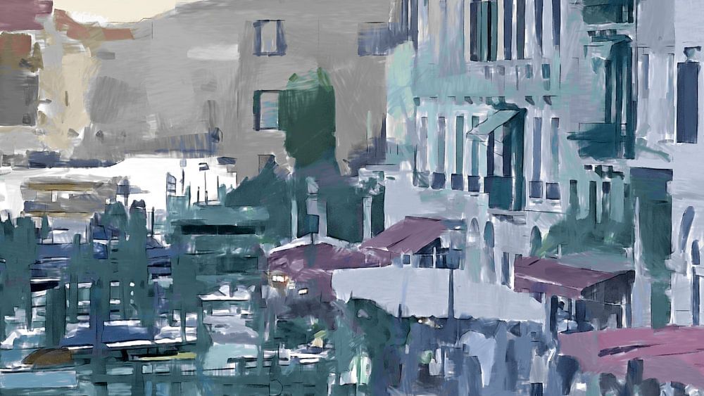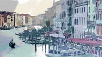 Ein modernes impressionistisches Kunstwerk, das den Blick von der Rialtobrücke auf den Canal Grande in Venedig bei Sonnenuntergang zeigt.