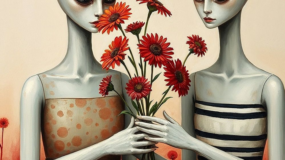 Dieses Werk fängt die Essenz von Entfremdung, Intimität und surrealer Schönheit ein. Zwei Figuren mit einer mystischen Aura teilen sich einen Strauß leuchtend orange-roter Blumen in einer Landschaft, die zwischen verträumt und schwer fassbar schwankt. Ihre langen, zarten Hände und großen, ausdrucksstarken Augen vermitteln ein Gefühl von Melancholie und Verbundenheit. Die schlichte, gestreifte und detailreiche Kleidung der Figuren, kombiniert mit einem Hintergrund aus subtil verblassenden Blumen, verströmt eine nostalgische Atmosphäre.