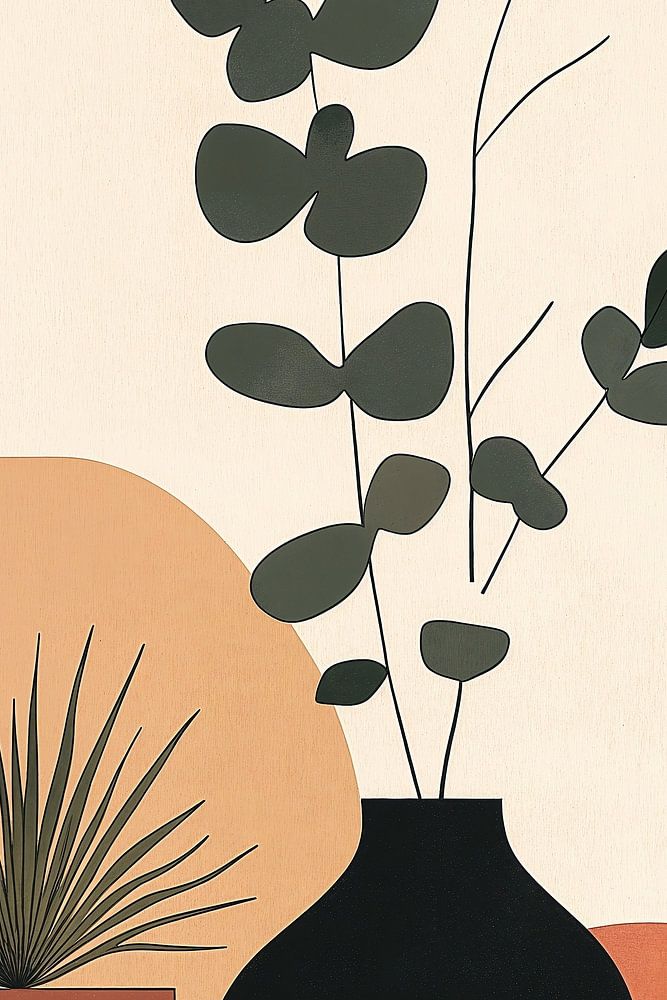 Eine stilvolle, minimalistische Komposition, in der eine schwarze Vase mit anmutigen Eukalyptuszweigen im Mittelpunkt steht, flankiert von einem Terrakottatopf mit einer grafischen Pflanze. Die warmen Erdtöne der Hintergrundformen in Pfirsich und Sand bilden ein harmonisches Ganzes mit den schlichten, modernen Linien der botanischen Elemente.
