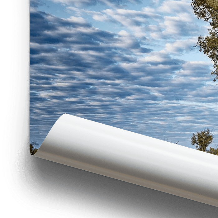 Eukalyptusbaum vor einem Himmel voller Schäfchenwolken fotografiert. Das Foto wurde in der Halbwüste im Nordwesten Australiens aufgenommen.