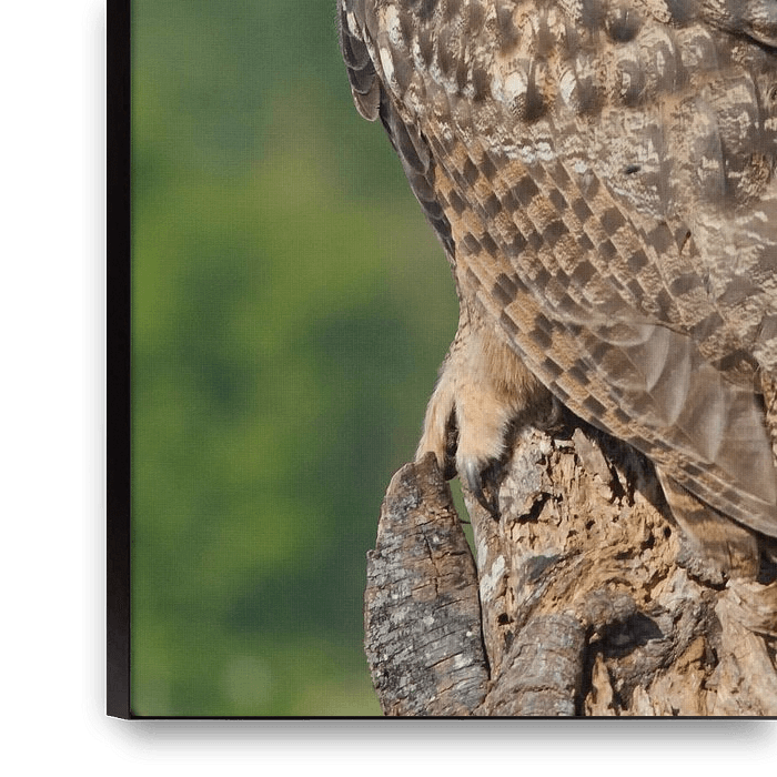 Bestelle das Foto Eule auf Baumstumpf von Petra Vastenburg als Reproduktion auf Leinwand, Alu-Dibond, als Poster, Fototapete oder Acrylglasbild.