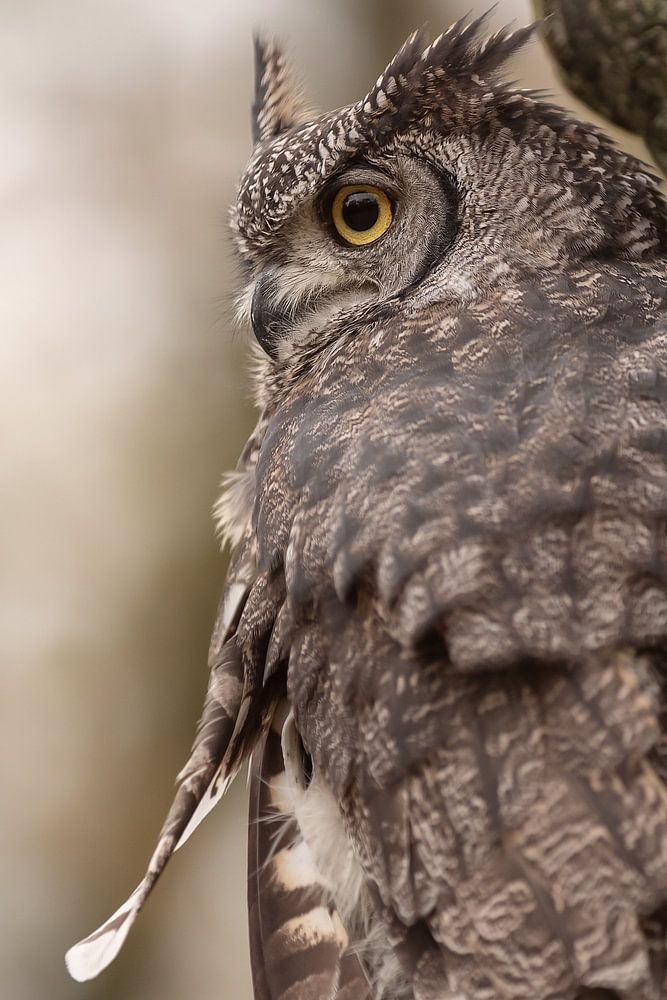 Foto eines afrikanischen Uhus, der in einem Baum sitzt. Die Eule schaut zurück. Im Hintergrund ist ein schönes Bokeh zu sehen.