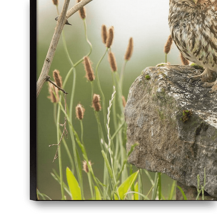 Waldkauz auf einem Felsen unter Akazien und zwischen Wegerichen