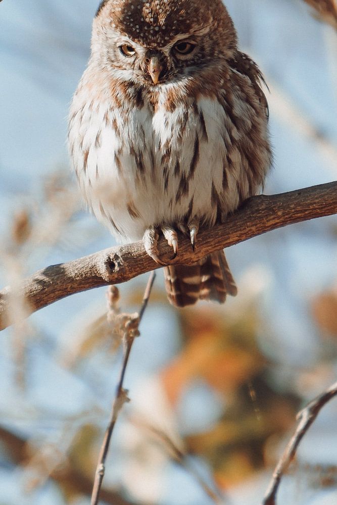 Eulen sind oft Symbole der Weisheit und des Geheimnisses, und dieses Porträt zeugt von ihrer Anmut und der subtilen Schönheit ihrer Umgebung. Die Eule ruht gemütlich inmitten der sanften Farben der Blumen. Dieser Moment fängt die Gelassenheit der Natur in ihrer reinsten Form ein. Er erinnert an die Verbundenheit aller Lebewesen, vom Raubtier oben bis zu den blühenden Blumen unten.