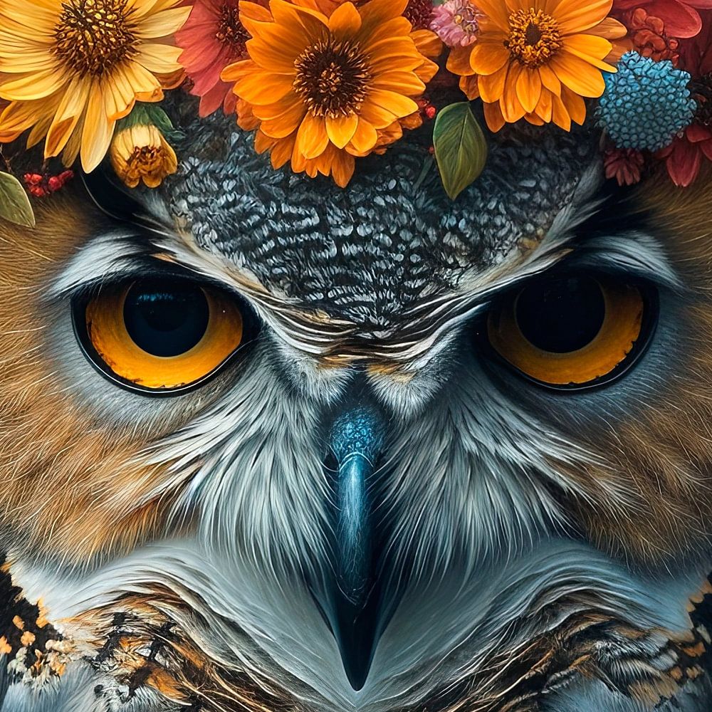 Eule in Wildblumen gehüllt, ein schönes, farbenfrohes Bild. AI generiert in Photoshop bearbeitet