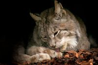 Ein Eurasischer Luchs liegt unter einer Kiefer und leckt sich das Hinterbein.