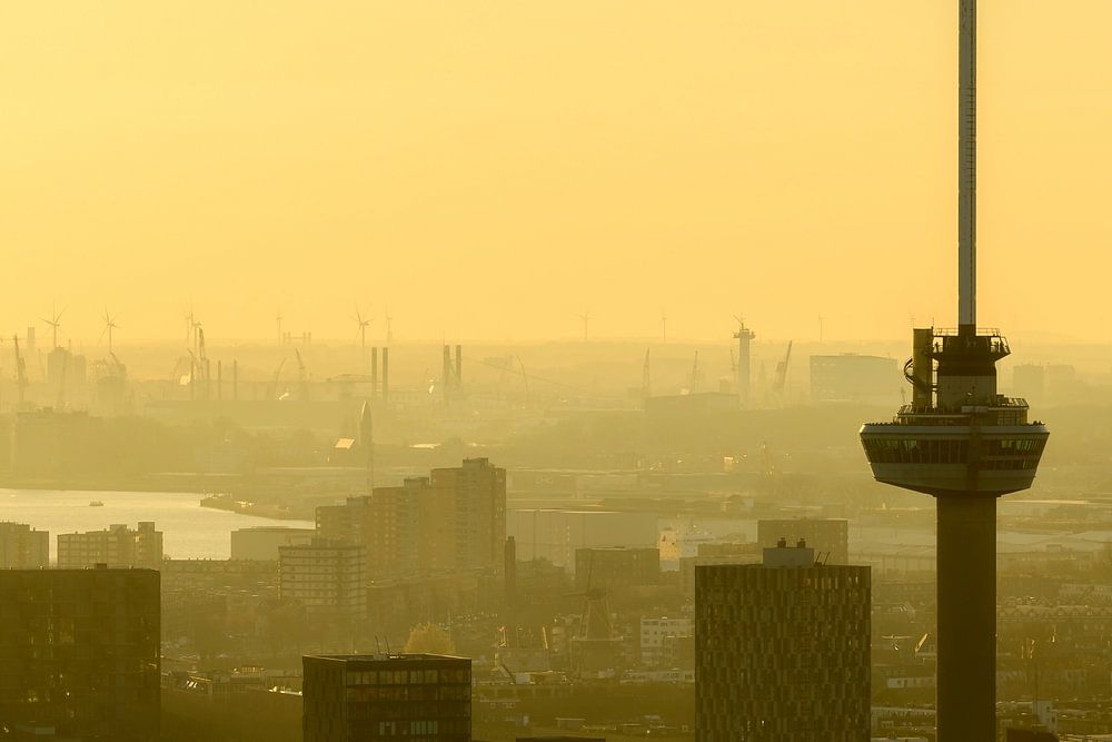 Euromast Rotterdam Skyline bei Sonnenuntergang aus der Höhe an der Neuen Maas. In der Ferne ist der Hafen von Rotterdam am Horizont zu sehen. Der Euromast auf der rechten Seite ist 185 Meter hoch. Er wurde 1960 nach einem Entwurf des Architekten Huig Maaskant und des Ingenieurs G. J. de Haan erbaut und ist nach wie vor eines der höchsten Bauwerke der Stadt Rotterdam.