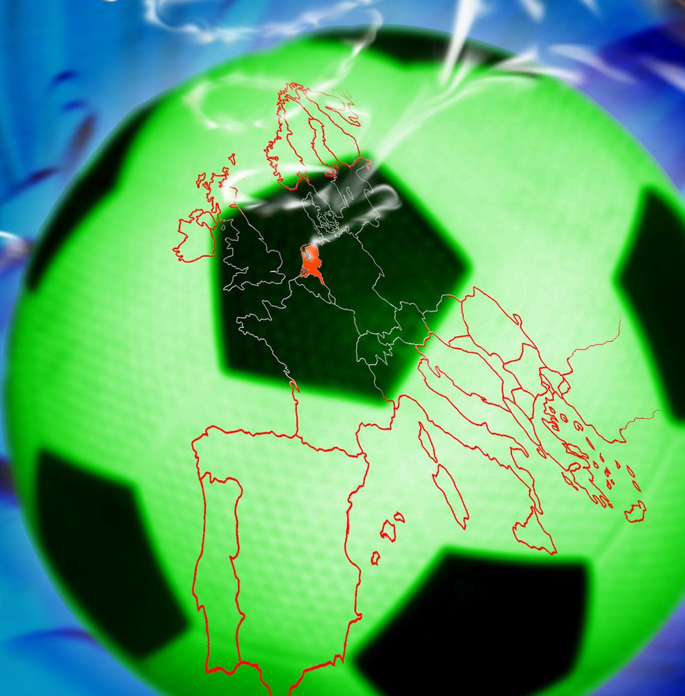 Ich möchte das kommende europäische Fußballturnier darstellen. Ich möchte die Farbe Orange durch die Verwendung der Kontrastfarbe Blau hervorstechen lassen. Ich sehe den Fußball als Weltkugel und Europa als Zentrum des Universums. Der Fußball bewegt sich auf einer spiralförmigen Bahn und springt von den Niederlanden ins Universum. Die Blume Gerbera ist sehr niederländisch und die Farbe ist orange.