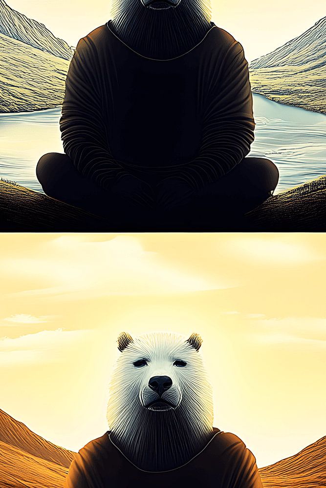 Ein mystisches Wesen sitzt in tiefer Meditation und überbrückt zwei Reiche - das eine ist in kühles Zwielicht getaucht, das andere glüht in goldenem Glanz. In schattenhafte Gewänder gekleidet, symbolisiert dieser Eisbär-gekrönte Weise Gleichgewicht, Weisheit und den ewigen Kreislauf von Licht und Dunkelheit. Die gespiegelten Landschaften spiegeln die Dualität der Existenz wider: Nacht und Tag, Stille und Wandel, Gelassenheit und Kraft.