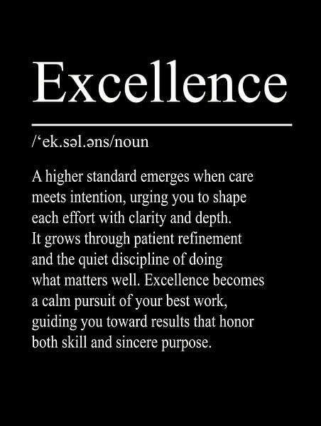 Das Wort Excellence steht für höchste Ansprüche, Sorgfalt und bewusste Hingabe. Dieses typografische Definitionsposter beschreibt den ruhigen Weg zu Qualität, Präzision und nachhaltigem Erfolg.