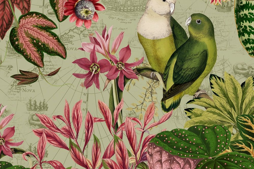 Stellen Sie sich ein luxuriöses Vintage-Gemälde im Querformat vor, das den Betrachter in einen tropischen Dschungel mit üppigen Palmenblättern, exotischen Blüten lebhaftem Laub und grünen exotischen Vögeln inmitten der grünen Landschaft entführt. Die in einem sepia-silbernen Farbschema gehaltene Szene strahlt zeitlose Eleganz und Raffinesse aus. Jedes Detail, von den filigranen Mustern der Blätter bis zu den anmutigen Posen der Vögel, ist sorgfältig dargestellt und weckt ein Gefühl von Opulenz und Nostalgie für eine vergangene Ära. Dieses botanische Meisterwerk besticht durch seinen Reichtum an Texturen und seine stimmungsvolle Atmosphäre und lädt den Betrachter ein, in die Schönheit der Natur einzutauchen.