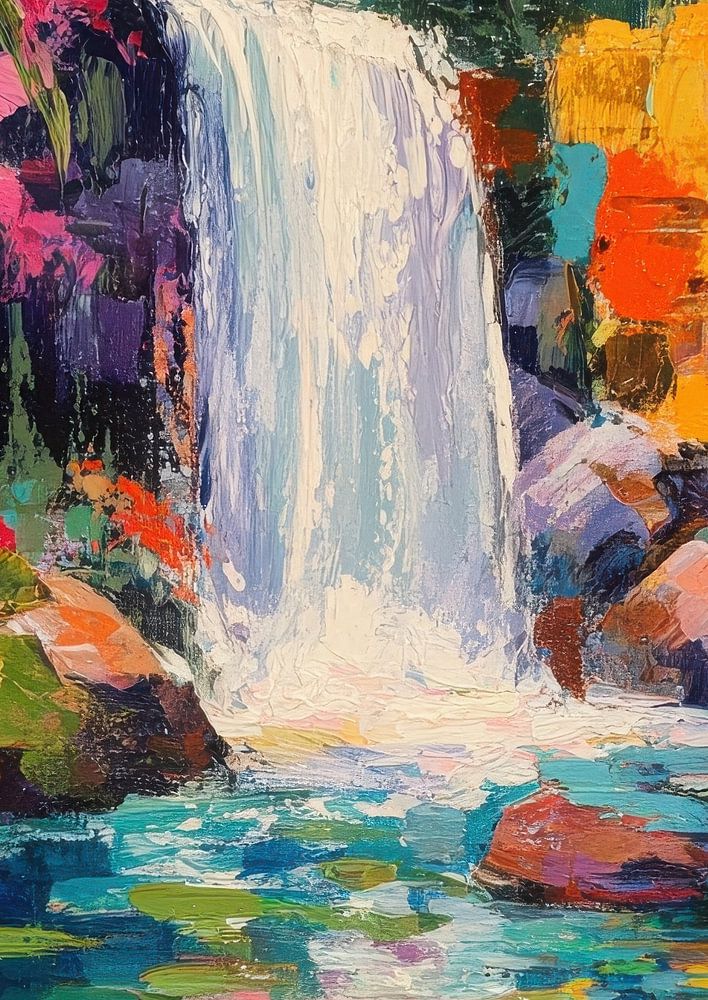 Dieses impressionistische Gemälde zeigt einen exotischen Wasserfall, umgeben von üppiger tropischer Vegetation und bunten Blumen. Das Wasser stürzt aus der Ferne in kristallklare Becken, während leuchtende Farben wie Pink, Rot, Grün und Gelb Tiefe und Lebendigkeit erzeugen. Weiche Pinselstriche vermitteln Textur und Bewegung, wodurch die Szene gleichzeitig abstrakt und atmosphärisch wirkt. Die Komposition fängt die Schönheit und Energie der Natur ein, vermittelt Freude, Leichtigkeit und Entspannung. Die harmonische Mischung aus kräftiger Farbpalette, tropischem Ambiente und fließender Wasserbewegung erzeugt ein farbenfrohes, dynamisches Kunstwerk voller Lebensfreude.
