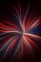 Dieses abstrakte Lichtbild zeigt einen zentralen Ausbruch von Lichtspuren, die sich wie eine Stereo-Explosion nach außen schlängeln. Die Farben Rot,…