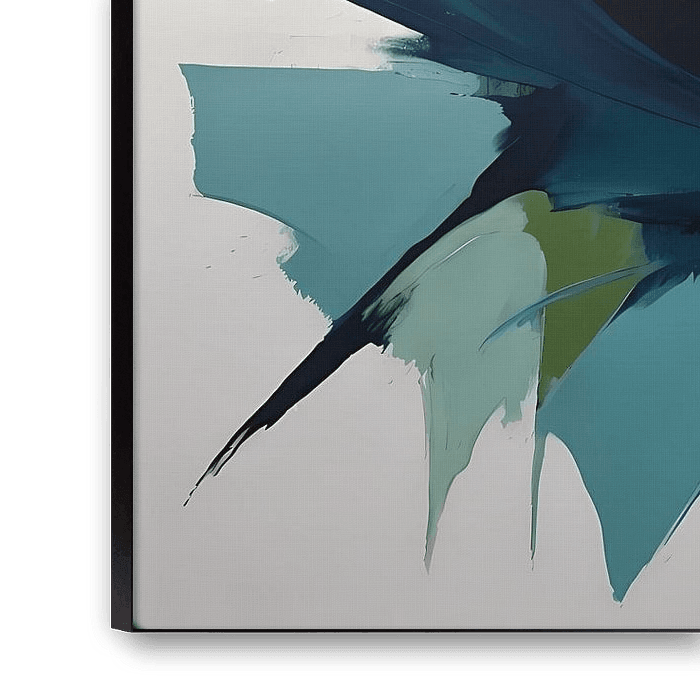 Tauchen Sie ein in die dynamische Symphonie von Formen und Farben mit diesem auffälligen abstrakten Design. Die kühnen Pinselstriche und die satten, tiefen Schwarz-, Blau- und Grüntöne erzeugen einen atemberaubenden visuellen Eindruck, der das Auge fesselt und die Fantasie anregt. Das Zusammenspiel von Licht und Schatten in Kombination mit den leuchtenden Farbklecksen vermittelt ein Gefühl von Bewegung und Energie und macht es zu einem Blickfang in jedem modernen Raum. Dieses Werk zelebriert den abstrakten Expressionismus, bei dem jeder Blick eine neue Schicht emotionaler Tiefe offenbart, was es zu einem sich ständig weiterentwickelnden Meisterwerk in Ihrer persönlichen Sammlung macht.