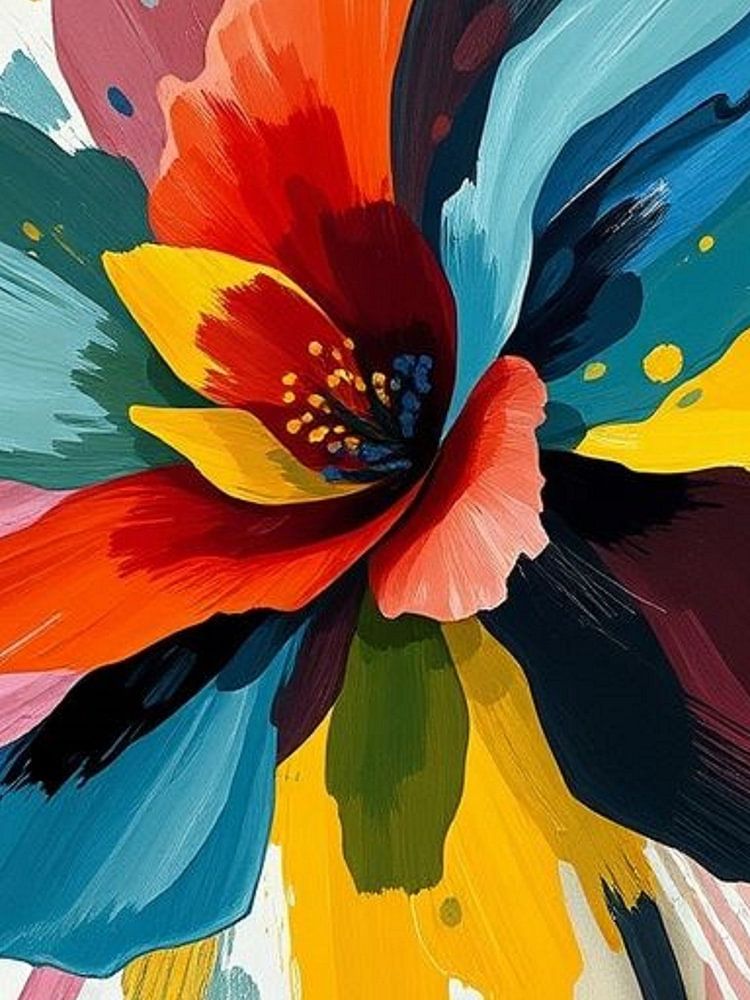 Dieses lebhafte abstrakte Gemälde zeigt eine dynamische, vielblättrige Blume, die vor kräftigen Farben strotzt, darunter tiefe Blautöne, satte Rottöne, leuchtende Gelbtöne, kräftige Orangetöne und zarte Rosatöne. Die Pinselstriche sind locker und ausdrucksstark, mit sichtbaren Texturen und Farbspritzern, die ein Gefühl von Bewegung und Spontaneität vermitteln. Ein dunkler, fast scherenschnittartiger Stiel untermalt die kaleidoskopische Farbexplosion, während Andeutungen von Weiß und gedämpfte Hintergrundtöne die lebhaften Farben richtig zur Geltung kommen lassen. Der Gesamteindruck ist der einer fröhlichen Energie und abstrakten floralen Schönheit.