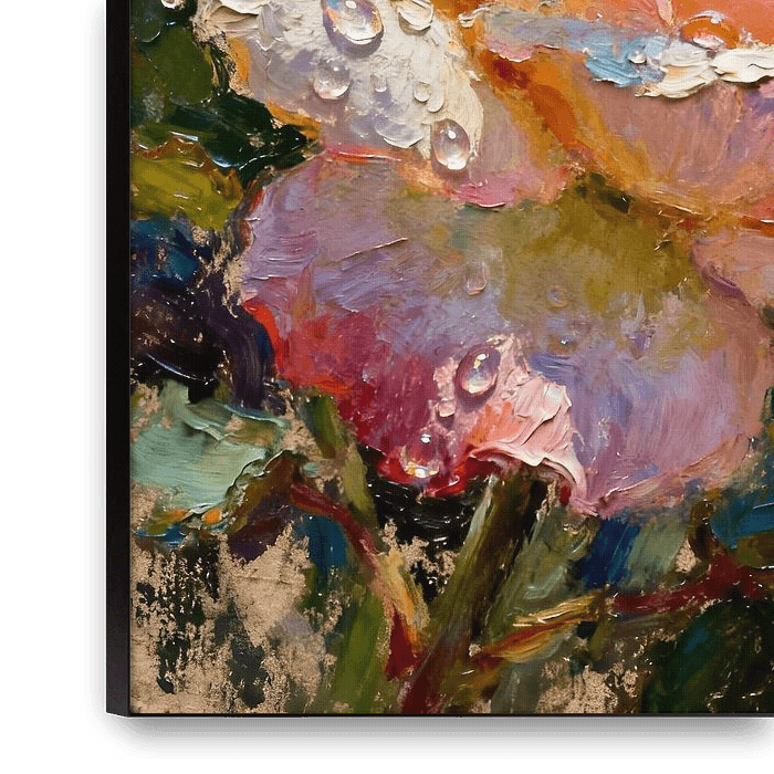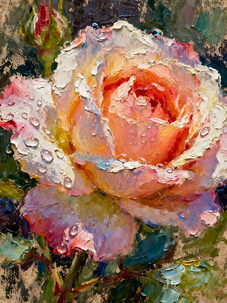 Dieses Werk konzentriert sich auf die sinnliche Darstellung einer einzelnen Rose, umgesetzt in einer kraftvollen, pastosen Maltechnik. Die dick aufgetragenen Farbschichten erzeugen eine ausgeprägte Dreidimensionalität und verleihen der Blüte eine fast skulpturale Präsenz. Warme Töne von Koralle, Creme und zartem Rosa verschmelzen mit…