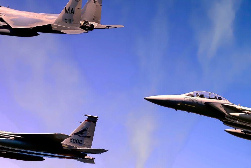 3 Amerikanische F-15 Eagle im Flug. Der Hintergrund wurde vom Fotografen angepasst. Foto aufgenommen während der Übung "Frisian Flag" auf dem Fliegerhorst Leeuwarden.