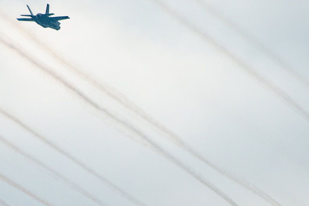 F16 gevechts vliegtuigen in formatie met de F35 er achter vliegend.de opvolger van de F16