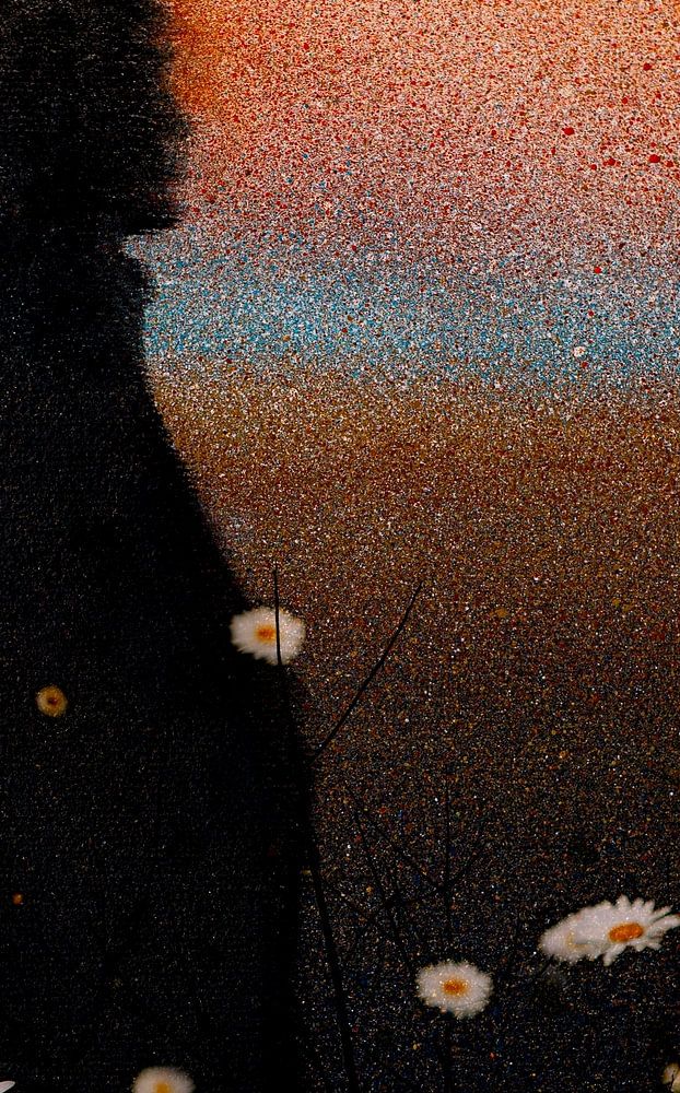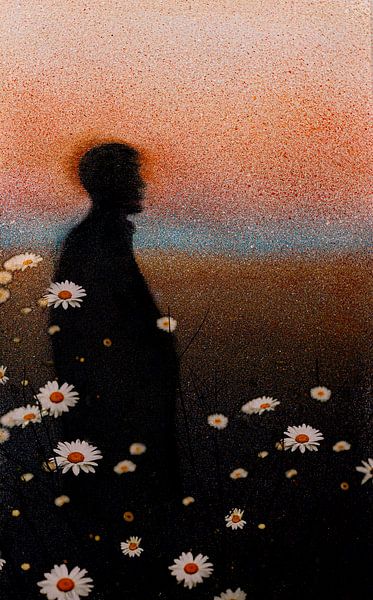 Dieses zeitgenössische figurative Kunstwerk zeigt eine einzelne menschliche Figur, die in einer offenen Landschaft steht.
