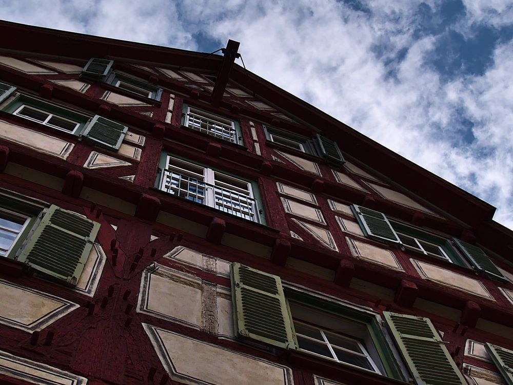 Blick von unten auf die bunte Fassade eines alten Fachwerkhauses in der Altstadt von Esslingen am Neckar, Baden-Württemberg, Deutschland mit weißer und roter Bemalung und grünen Fensterläden unter einem leicht bewölkten Himmel.
