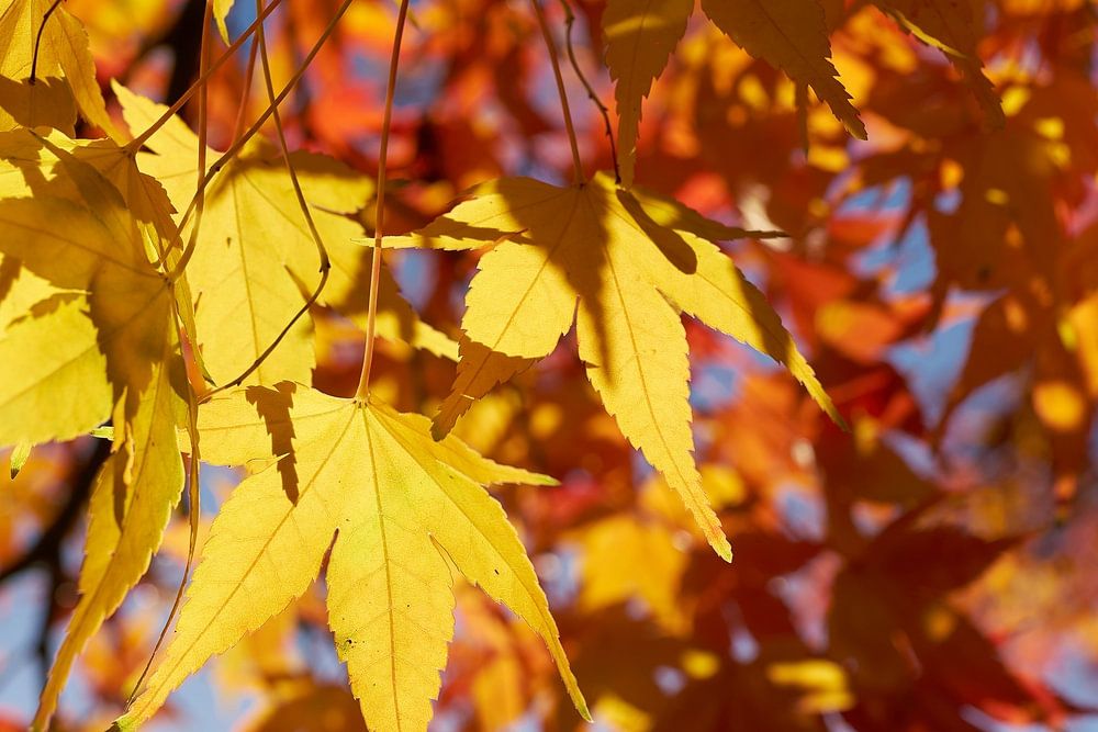 Blätter eines japanischen Fächerahorn mit leuchtender Herbstfärbung in einem Park in Deutschland
